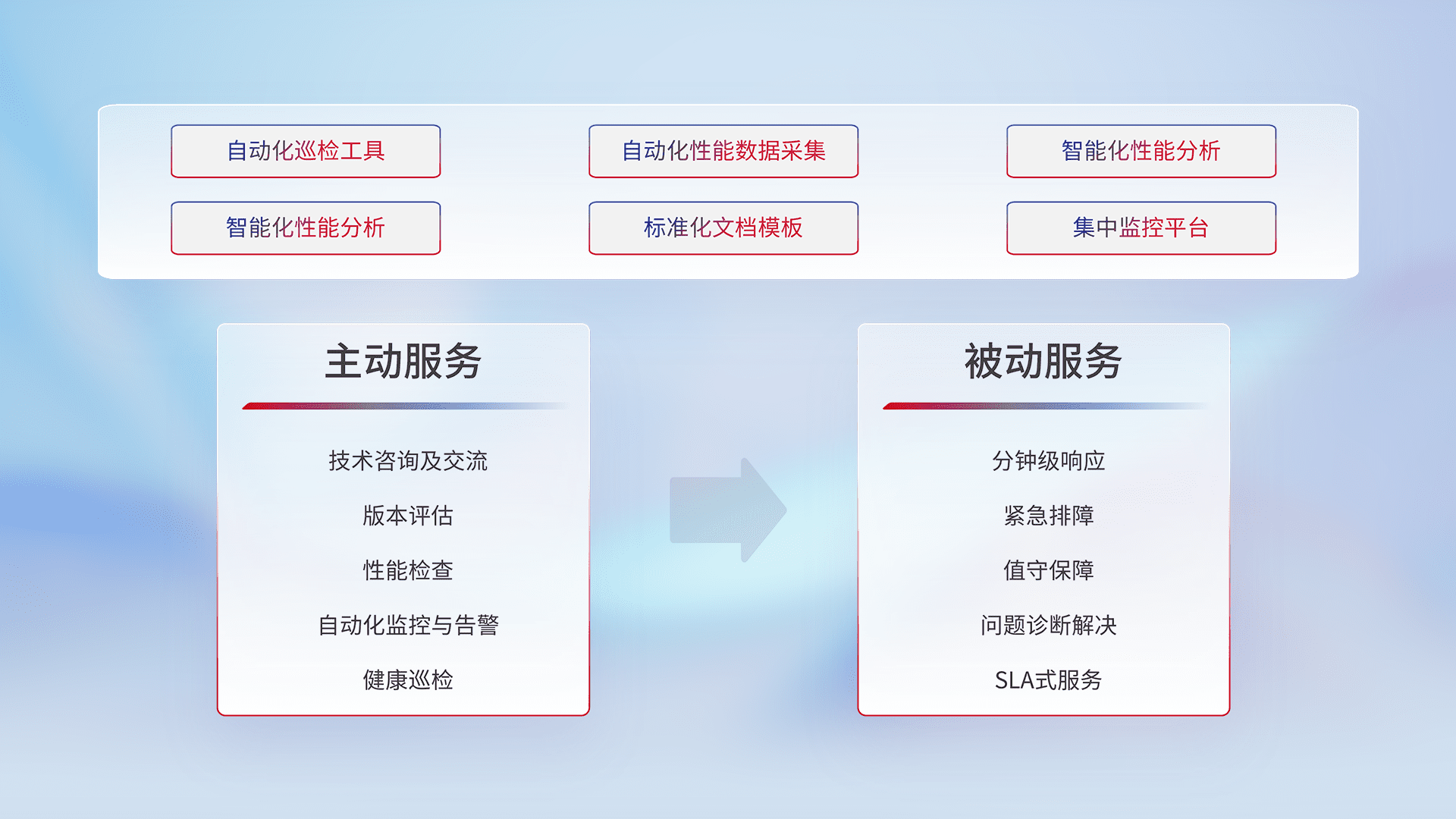智能化工具和标准化文档,,,保障服务质量,,,,提供主动服务(包含技术咨询、、、、版本评估、、、、性能检查、、自动化监控与告警、、、健康巡检)和被动服务包含(分钟级响应、、、紧急排障、、、、值守保障、、、、问题诊断解决、、SLA服务)。。