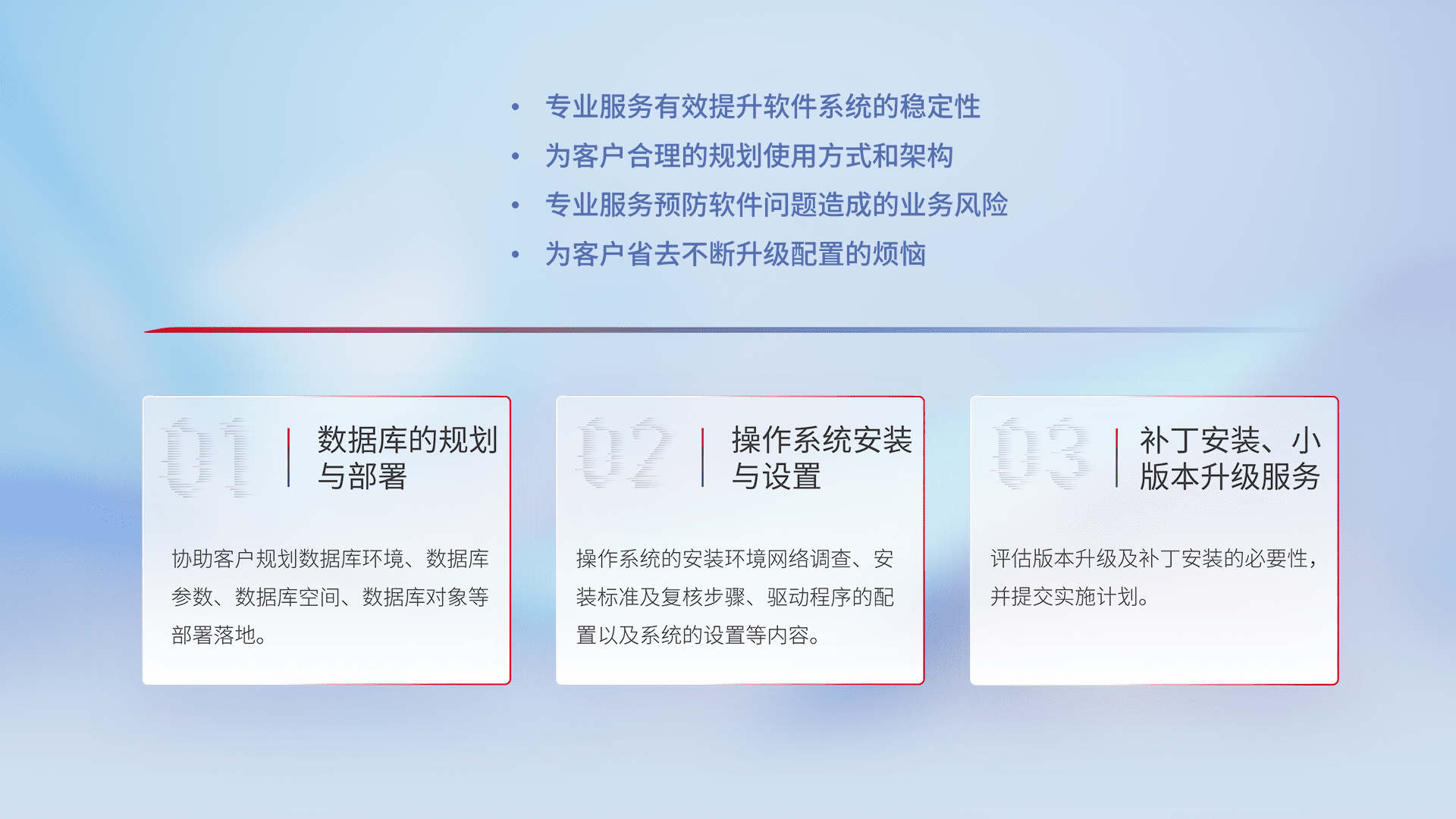 为客户提供软件规模升级、、快速部署、、、、按需配置的专业服务,,从数据库的规划与部署到操作系统的安装与设置,,再到补丁安装和小版本升级提供支持。。